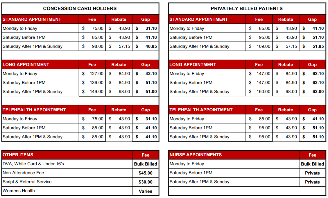 Please note that procedures such as skin excisions, Mirena insertions, Implanon insertions/removals, iron infusions, intravenous medications and wound care will attract an additional out-of-pocket fee to cover the cost of consumables. Our team is happy to provide an accurate estimate upon request.